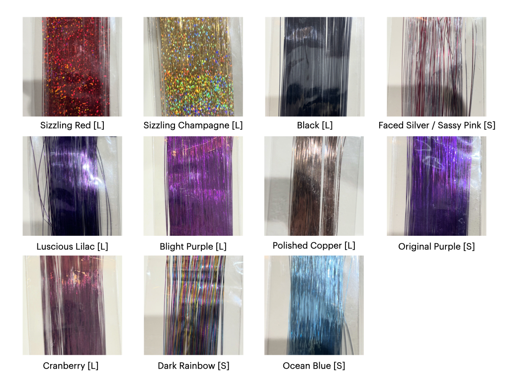 Black, Cranberry, Dark Rainbow, Faced Sliver / Sassy Pink, Luscious Lilac, Ocean Blue, Original Purple, Polished copper, Sizzling Champagne, Sizzling Red